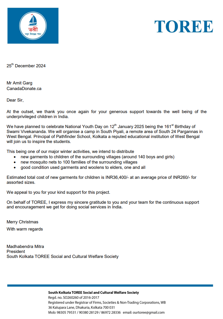 Sponsor - CAD150 - INR10000 - CanadaDonate.ca -Cloth4Every1.com