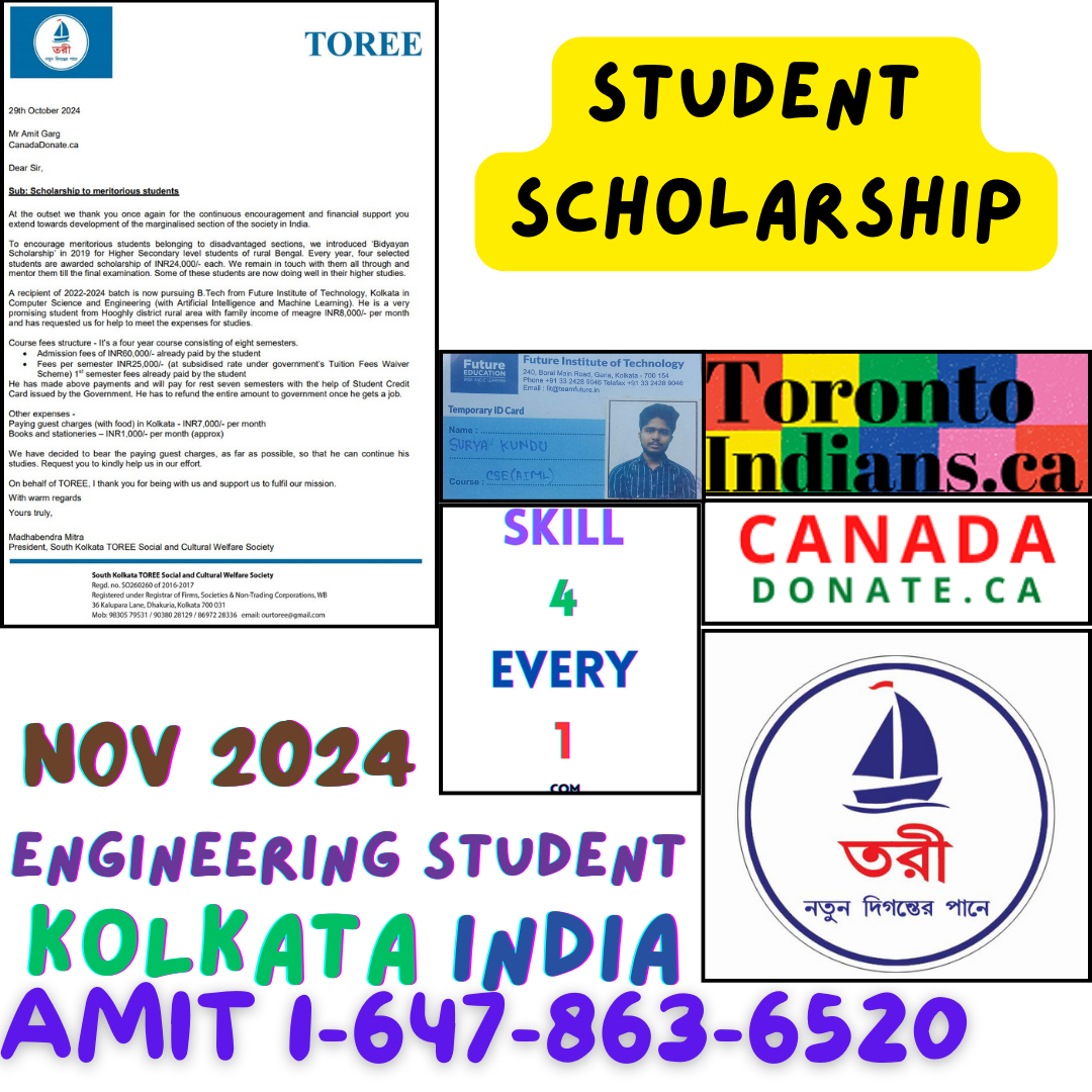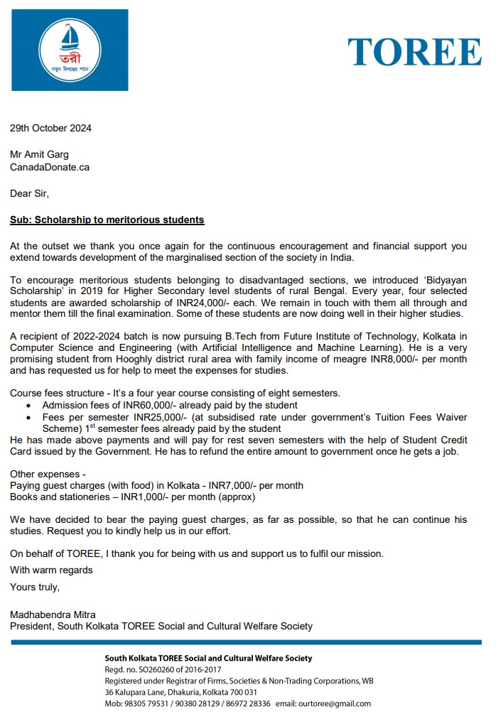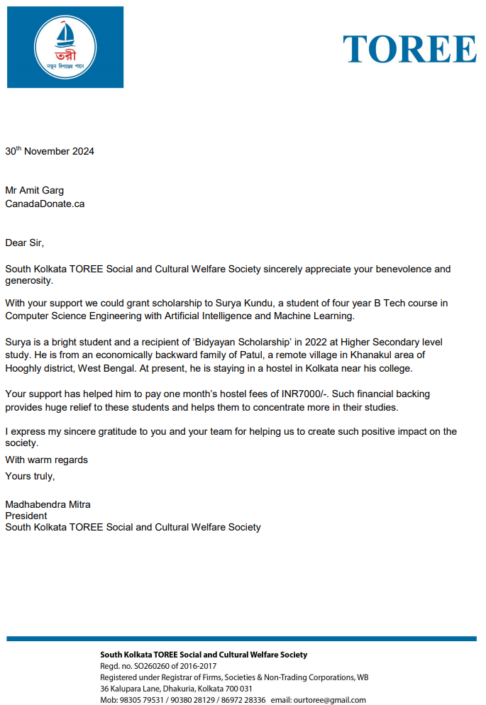 Student - Surya Kundu. He is a sincere, hard working student doing consistant progress. He got scholarship from TOREE in 2022 Results: 2022 - Passed Madhyamik- 89.43% 2024 - Passed Higher Secondary- 98.16 percentile 2024 - Got admission in B.Tech (4 year degree course) Since Surya is paying the semester fees and other college expenses through Student Credit Card he is already carrying a liability. He is staying in a hostel in Kolkata as paying guest. Our plan is to provide him support for the hostel expenses for four years in phased manner. The amount depends on fund arrangement.