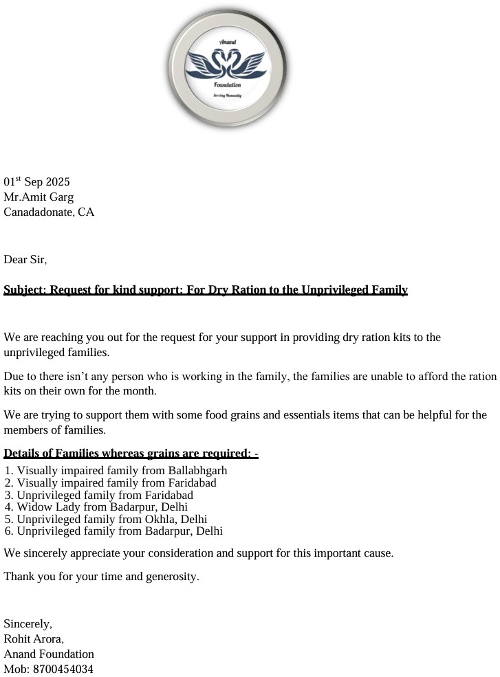 for Unprivileged family from Faridabad